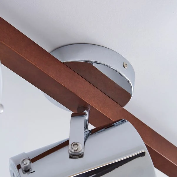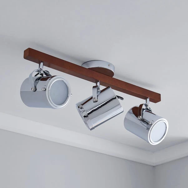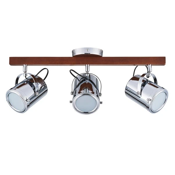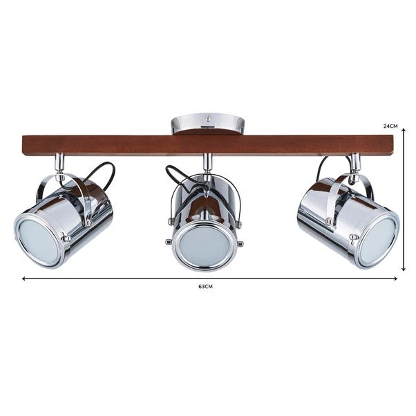 Elegantly crafted in a chrome and wooden finish to give your room a stylish touch, this studio inspired ceiling light features three spotlights.