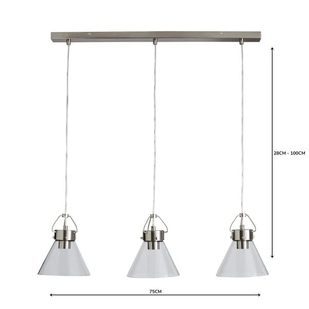 The Delavin 3 Light Pendant features a stunning Satin Nickle finish as well as an elegant tapered glass shade. This lamp is adjustable, dimmable and features a strong and durable steel construction.