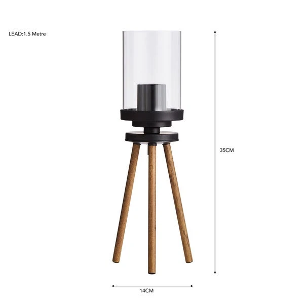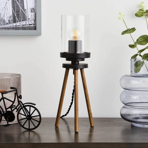 Add a unique style to your home with our Fulton tripod style table lamp, featuring tripod style legs for a trendy look. It comes complete with a clear glass shade with an exposed bulb for that modern touch and is finished in a rustic Pine coating with an in-line switch which is easy to flick on and off whenever you desire.