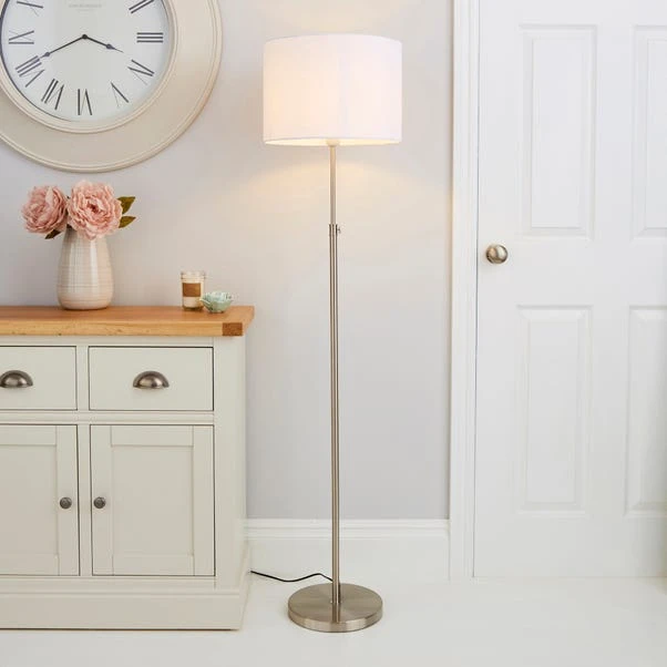 Introduce a beautiful and chic element to your home décor with the Hemming Extendable Floor Lamp, featuring a solid durable steel base with a smooth chrome finish. The design of the crisp white pongee shade adds a modern touch to your home décor.