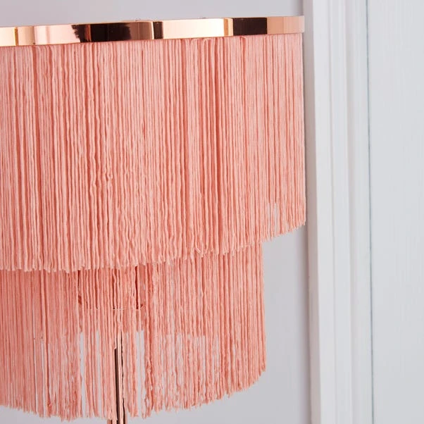 This Jaz floor lamp features a two tier tassel fringe shade with an inline floor switch, a cable length of 100cm and completed with a smooth chrome finish.
