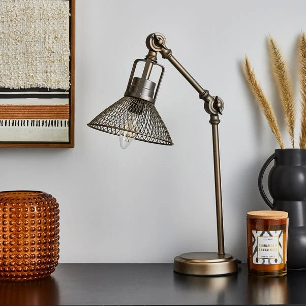 Add an industrial touch to your home with this stunning Nicholas Industrial Table Lamp. Finished in a distressed pewter finish metal base with an adjustable mesh head for an industrial look. This table lamp is perfect for your room, desk or workspace. Complete with a 1.5m black cable and Inline switch. Coordinate your home with matching Nicholas family items.