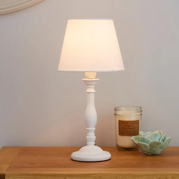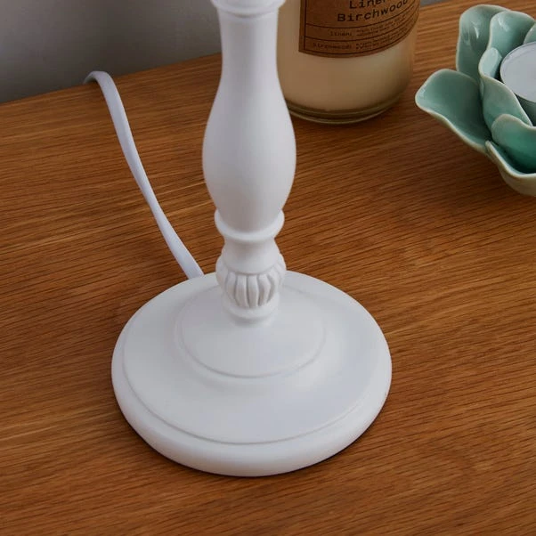 Finished with a soft ivory tapered shade this simple Tofty table lamp is crafted with a a carved resin base.