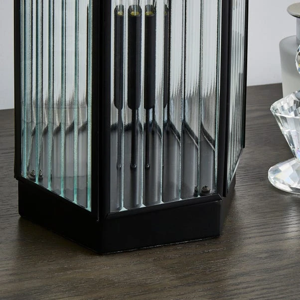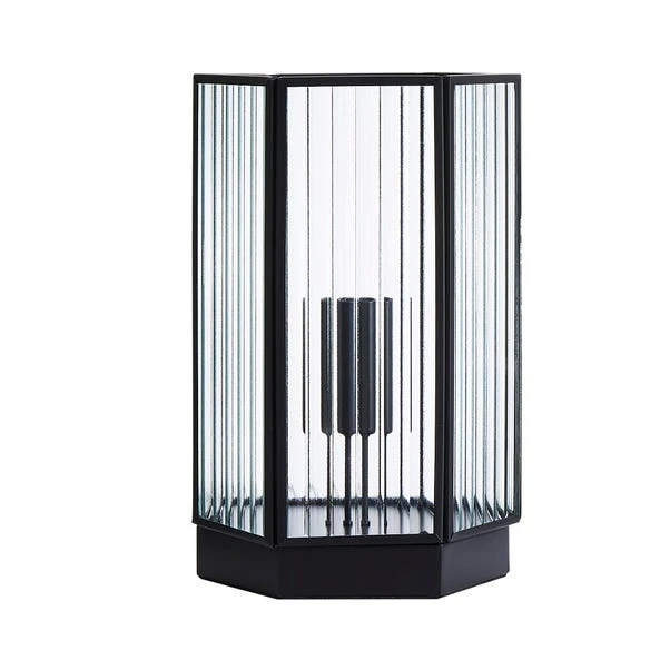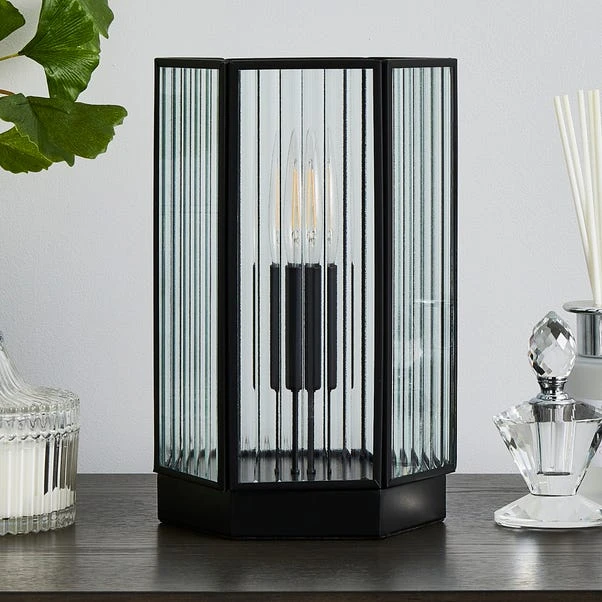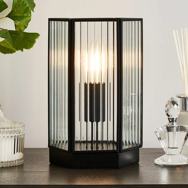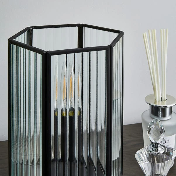 This luxurious table lamp features a black painted frame and ribbed glass, allowing you to create a contemporary look within your chosen room. This table lamp requires 1 x Candle SES (E14) – 4W LED which is not included with the lamp. The table lamp comes with a 1.2m cable and an in-line switch. A 2-year guarantee is provided with this table lamp.