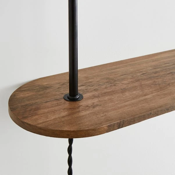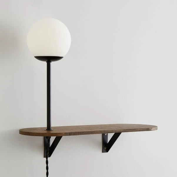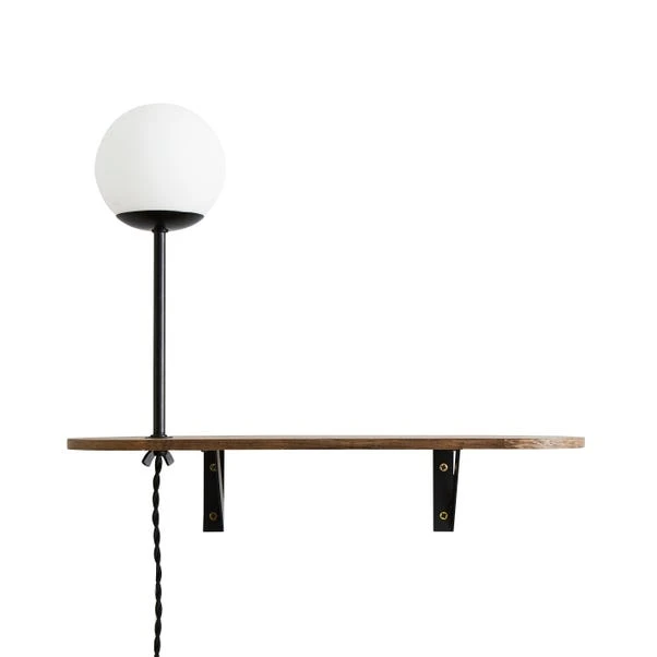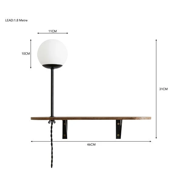 The Elements Visby Shelf Wall Light is a multifunctional design, perfect for displaying ornaments or decorative accessories in your room and brightening up your space. Designed with a black and walnut effect shelf and a modern white round glass shade. This shelf wall light comes with a 1.8m black twisted cable plug in switch and is easy to assemble on your wall. Its modern contemporary design will complement a range of home decors beautifully.