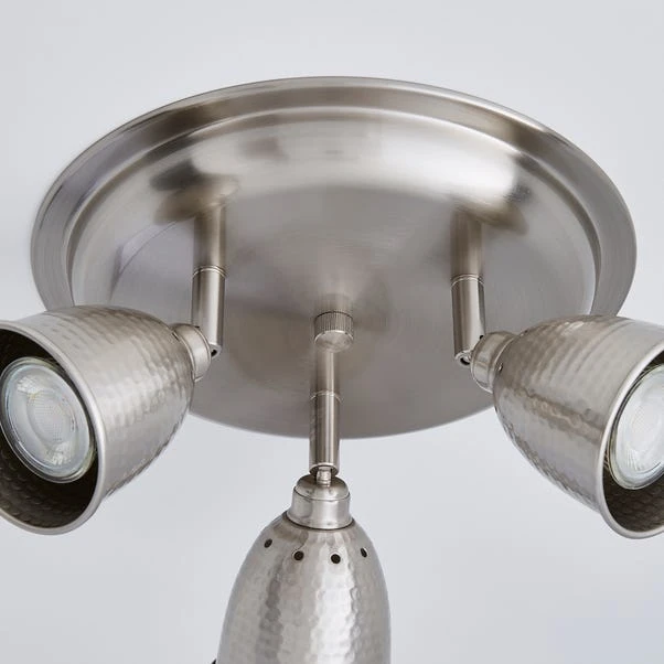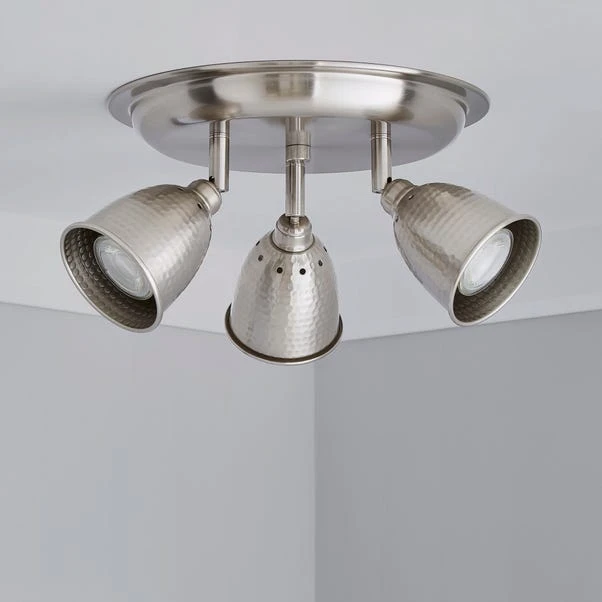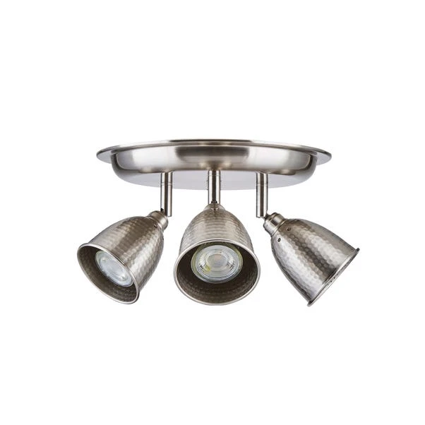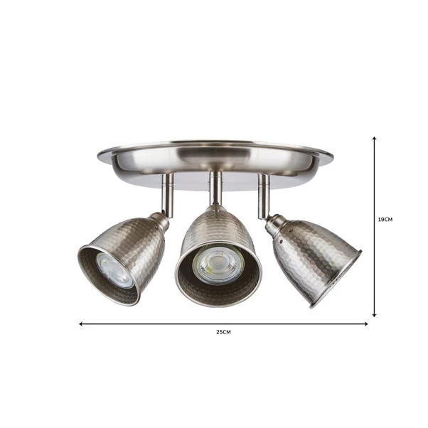Designed with a three light structure, this dimmable ceiling fitting features a rounded base plate and hammered-effect light shades finished in a satin nickel tone.